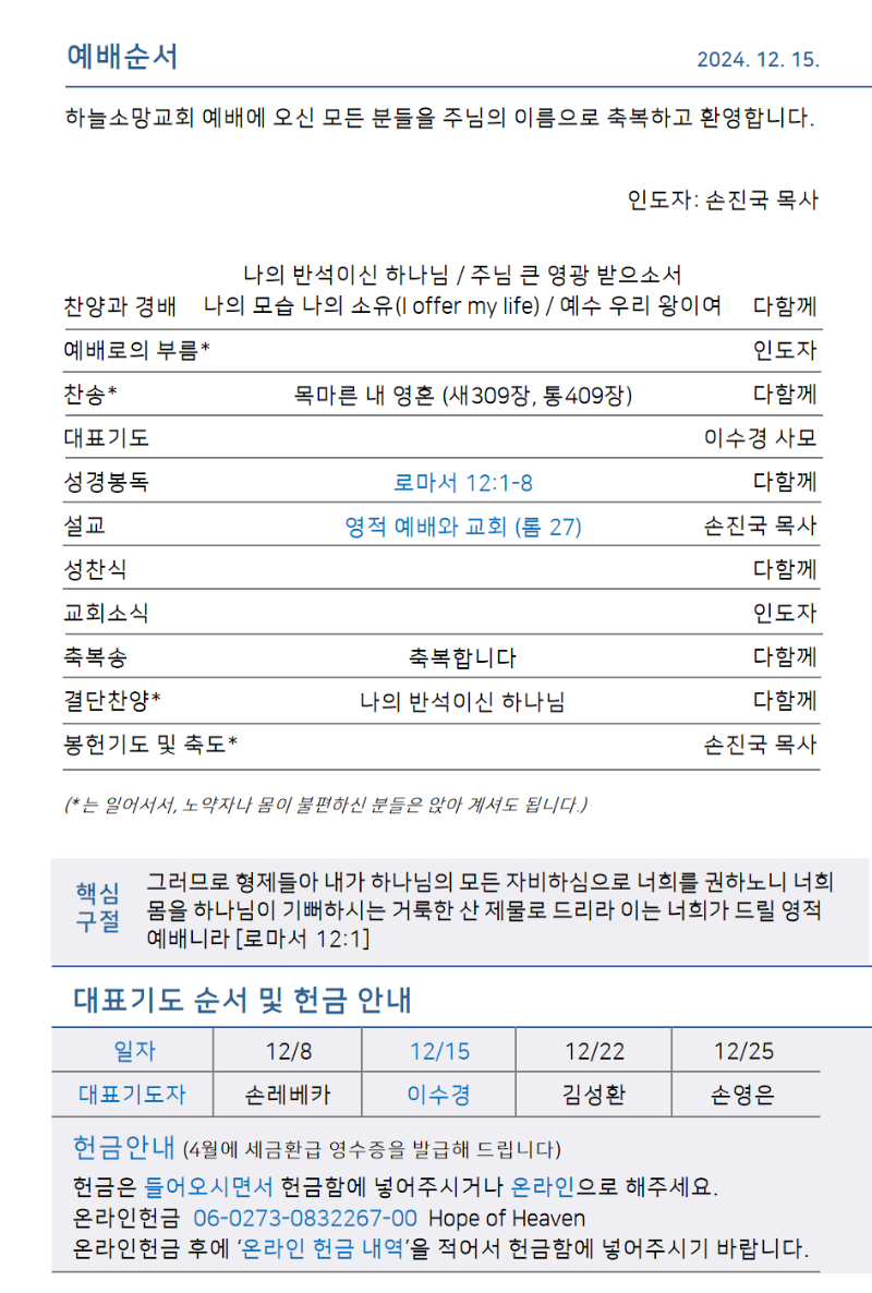 | 2024년 12월 25일 성탄절 예배 순서지 (0) | 2024.12.25 |
