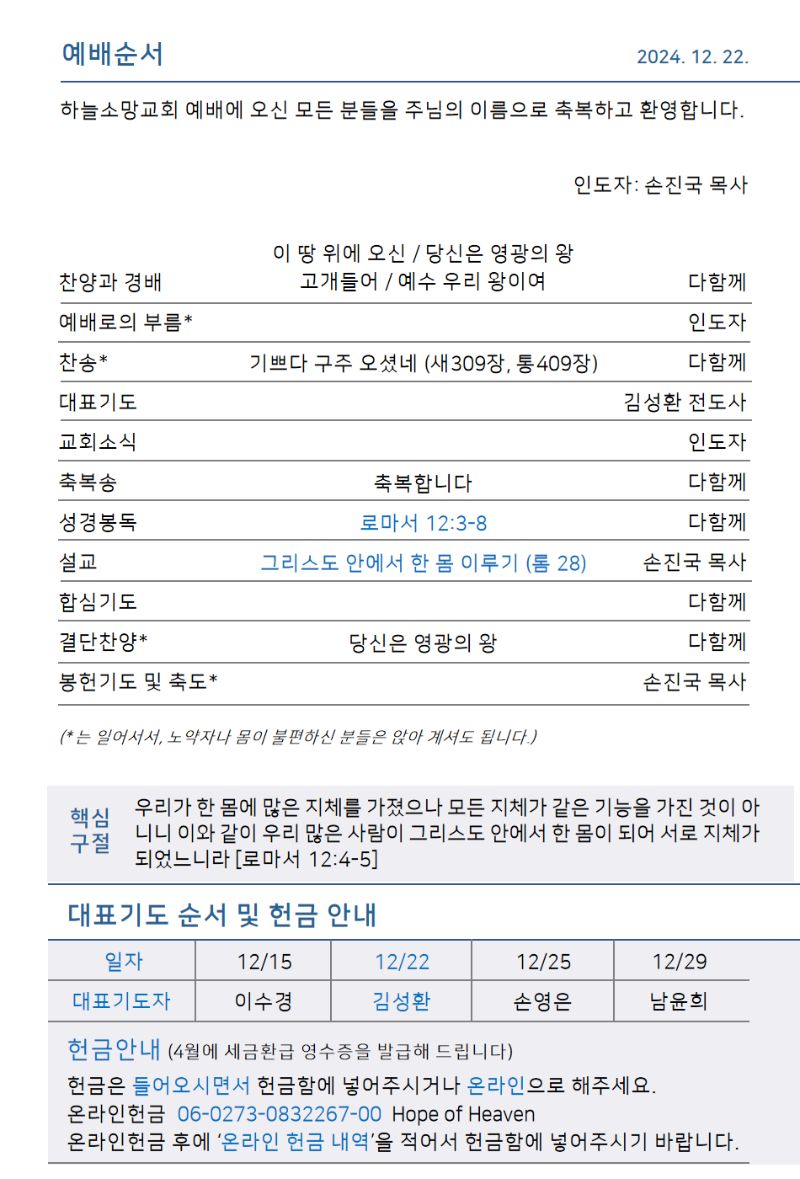 | 2024년 12월 25일 성탄절 예배 순서지 (0) | 2024.12.25 |