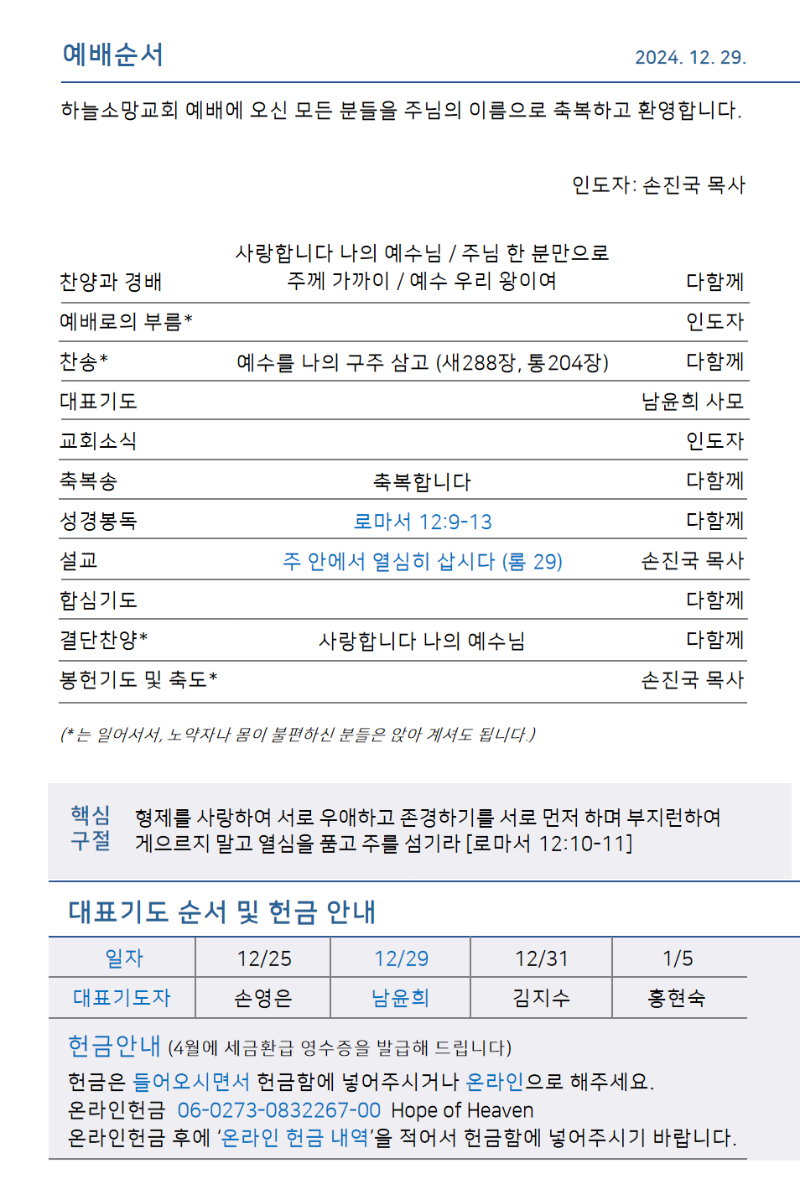 | 2024년 12월 25일 성탄절 예배 순서지 (0) | 2024.12.25 |