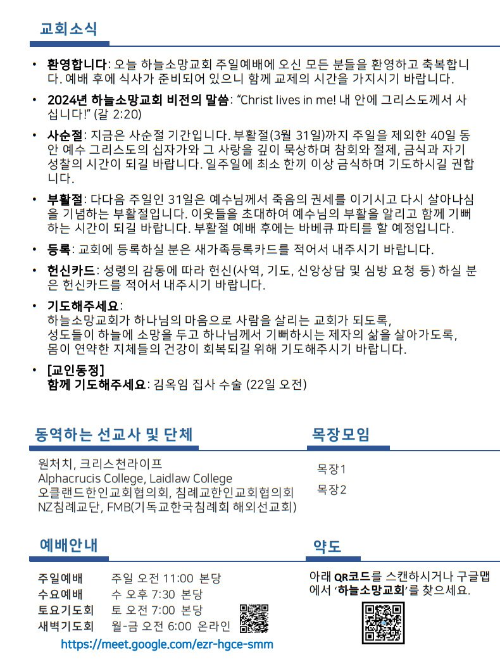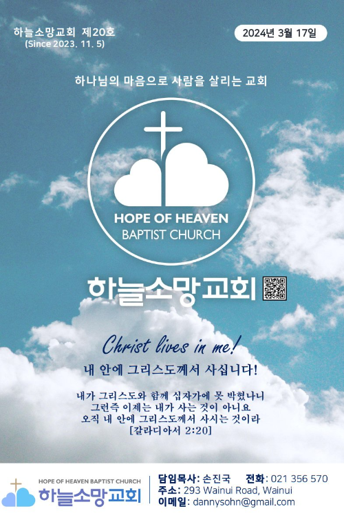하늘소망교회(담임 손진국 목사)는 뉴질랜드 오클랜드 북부 실버데일에 세워진 한인교회로 '하나님의 마음으로 사람을 살리는 교회'입니다.