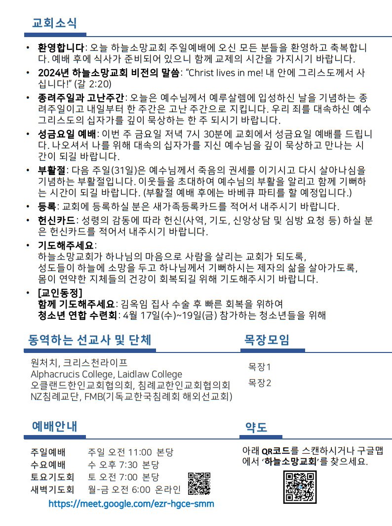 하늘소망교회(담임 손진국 목사)는 뉴질랜드 오클랜드 북부 실버데일에 세워진 한인교회로 '하나님의 마음으로 사람을 살리는 교회'입니다.