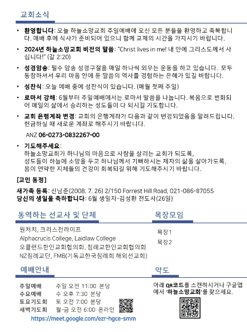하늘소망교회(담임 손진국 목사)는 뉴질랜드 오클랜드 북부 실버데일에 세워진 한인교회로 '하나님의 마음으로 사람을 살리는 교회'입니다.