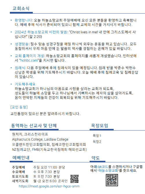 하늘소망교회(담임 손진국 목사)는 뉴질랜드 오클랜드 북부 실버데일에 세워진 한인교회로 '하나님의 마음으로 사람을 살리는 교회'입니다.