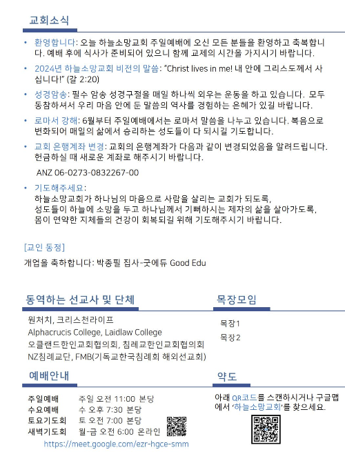 하늘소망교회(담임 손진국 목사)는 뉴질랜드 오클랜드 북부 실버데일에 세워진 한인교회로 '하나님의 마음으로 사람을 살리는 교회'입니다.