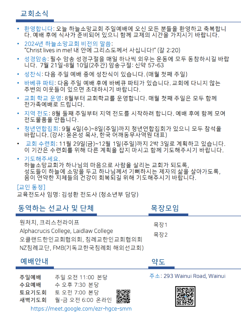 Hope of Heaven Baptist Church 하늘소망교회(담임 손진국 목사)는 뉴질랜드 오클랜드 북부 실버데일에 세워진 한인교회로 '하나님의 마음으로 사람을 살리는 교회'입니다.