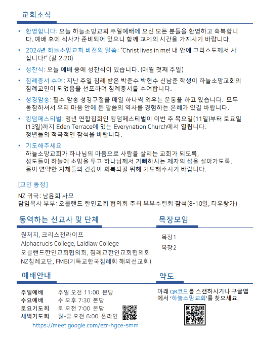 Hope of Heaven Baptist Church 하늘소망교회(담임 손진국 목사)는 뉴질랜드 오클랜드 북부 실버데일에 세워진 한인교회로 '하나님의 마음으로 사람을 살리는 교회'입니다.