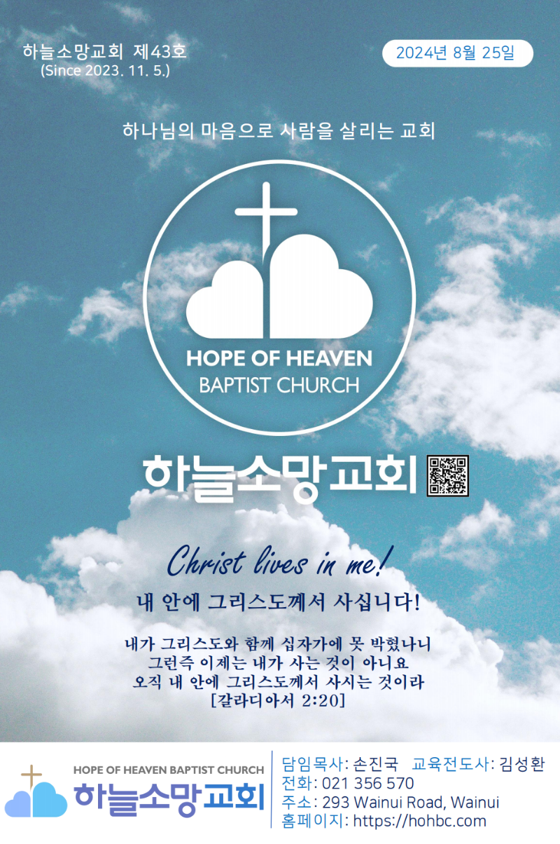 Hope of Heaven Baptist Church 하늘소망교회(담임 손진국 목사)는 뉴질랜드 오클랜드 북부 실버데일에 세워진 한인교회로 '하나님의 마음으로 사람을 살리는 교회'입니다.