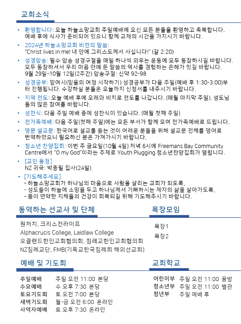 Hope of Heaven Baptist Church 하늘소망교회(담임 손진국 목사)는 뉴질랜드 오클랜드 북부 실버데일에 세워진 한인교회로 '하나님의 마음으로 사람을 살리는 교회'입니다.