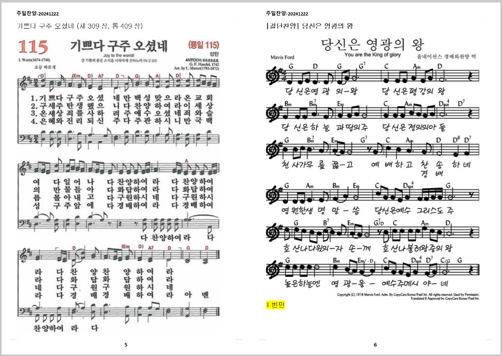 5. 찬송가 - 기쁘다 구주 오셨네 (새309장, 통409장)