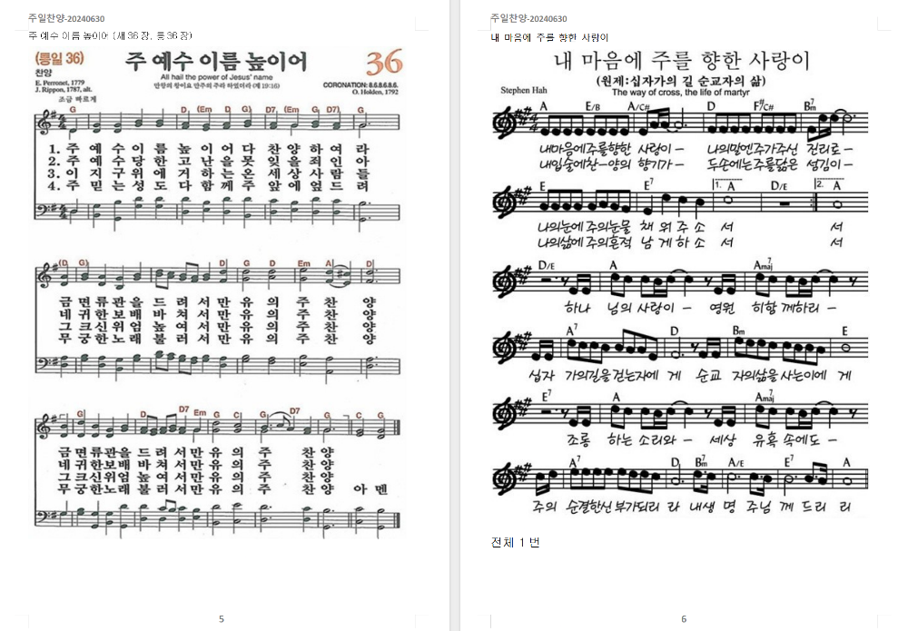 5. 찬송가 - 주 예수 이름 높이어 (새36장, 통36장)