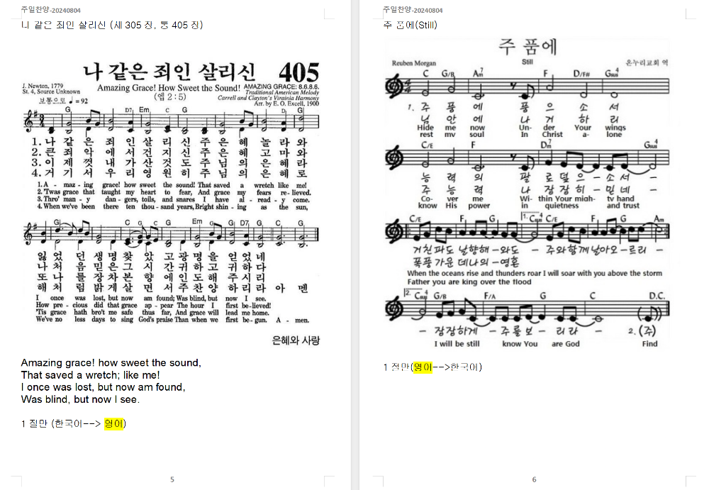 5. 찬송가 - 나 같은 죄인 살리신 Amazing grace (새305장, 통405장)