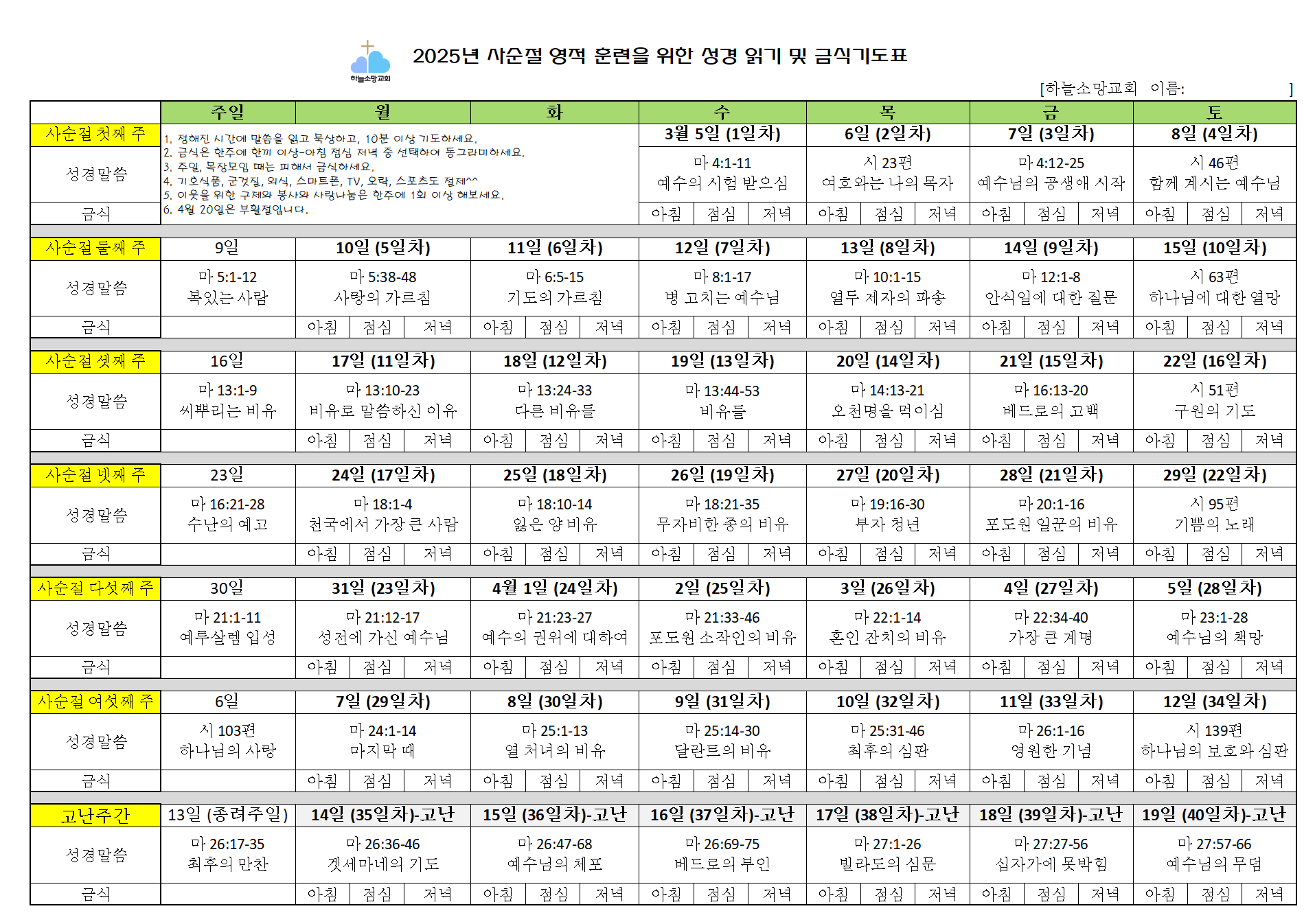 2025년 사순절 영적 훈련을 위한 성경 읽기 및 금식기도표