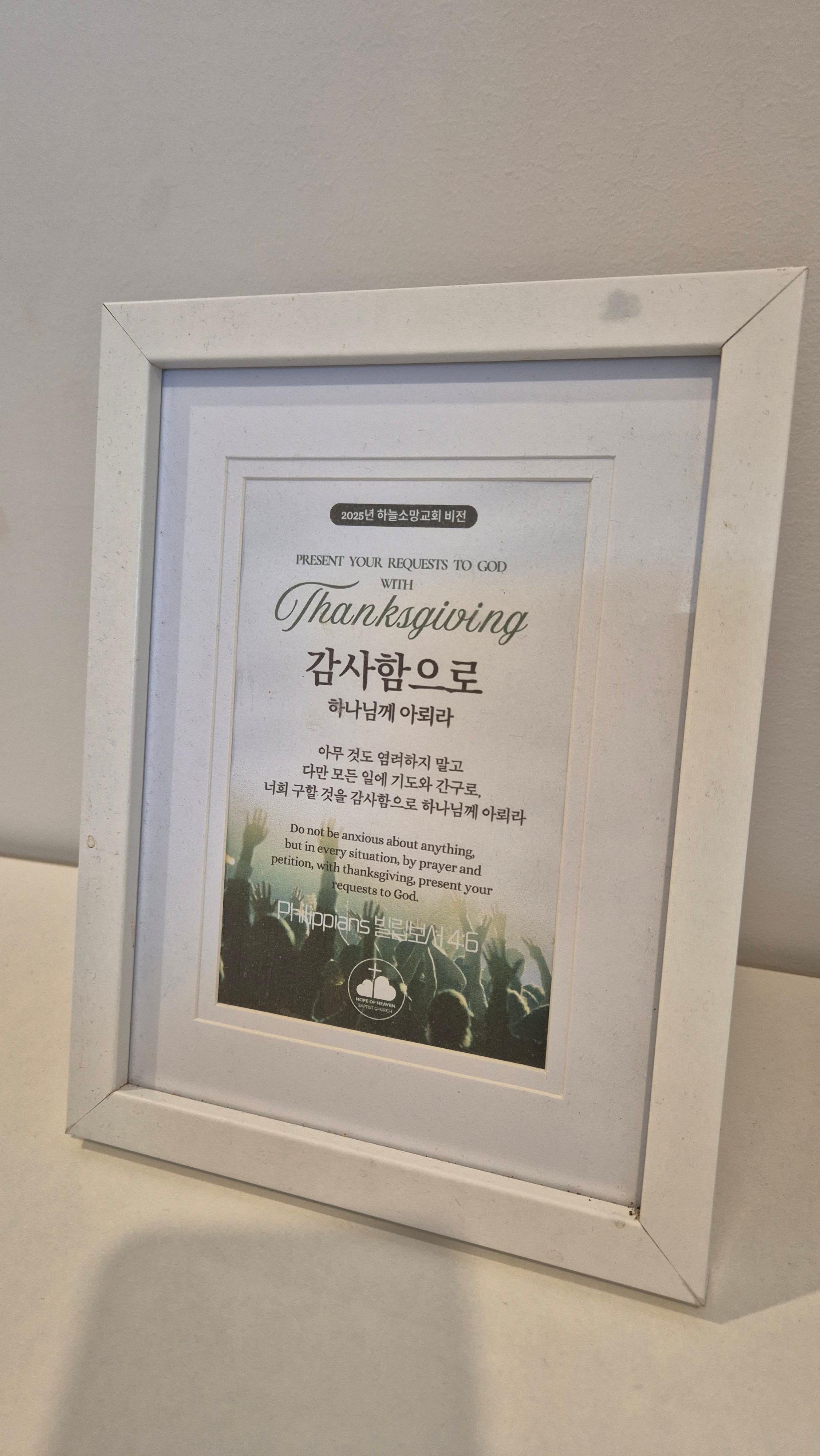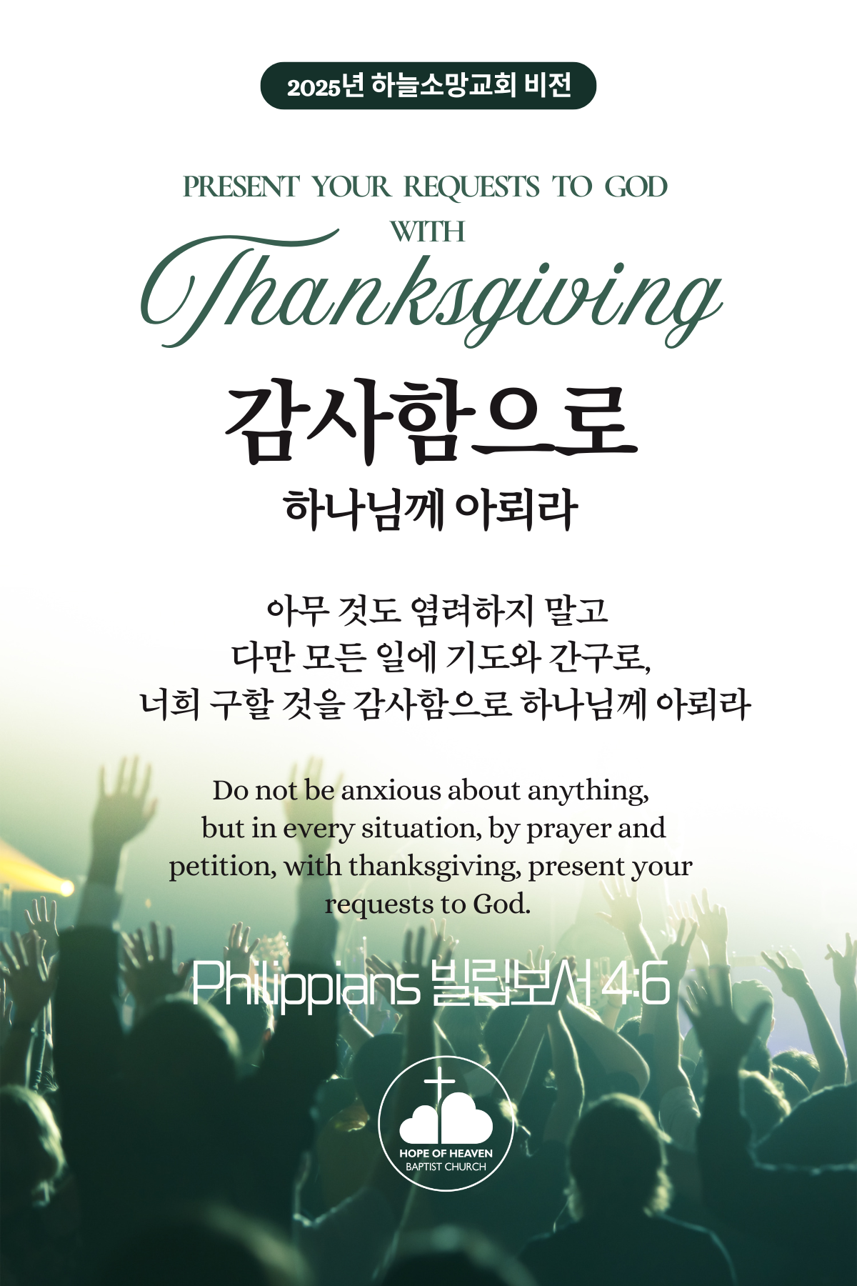 [빌립보서 4:6] 아무 것도 염려하지 말고 다만 모든 일에 기도와 간구로, 너희 구할 것을 감사함으로 하나님께 아뢰라