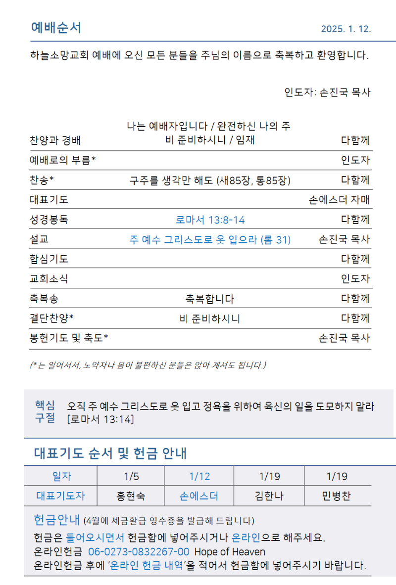 | 2024년 12월 25일 성탄절 예배 순서지 (0) | 2024.12.25 |