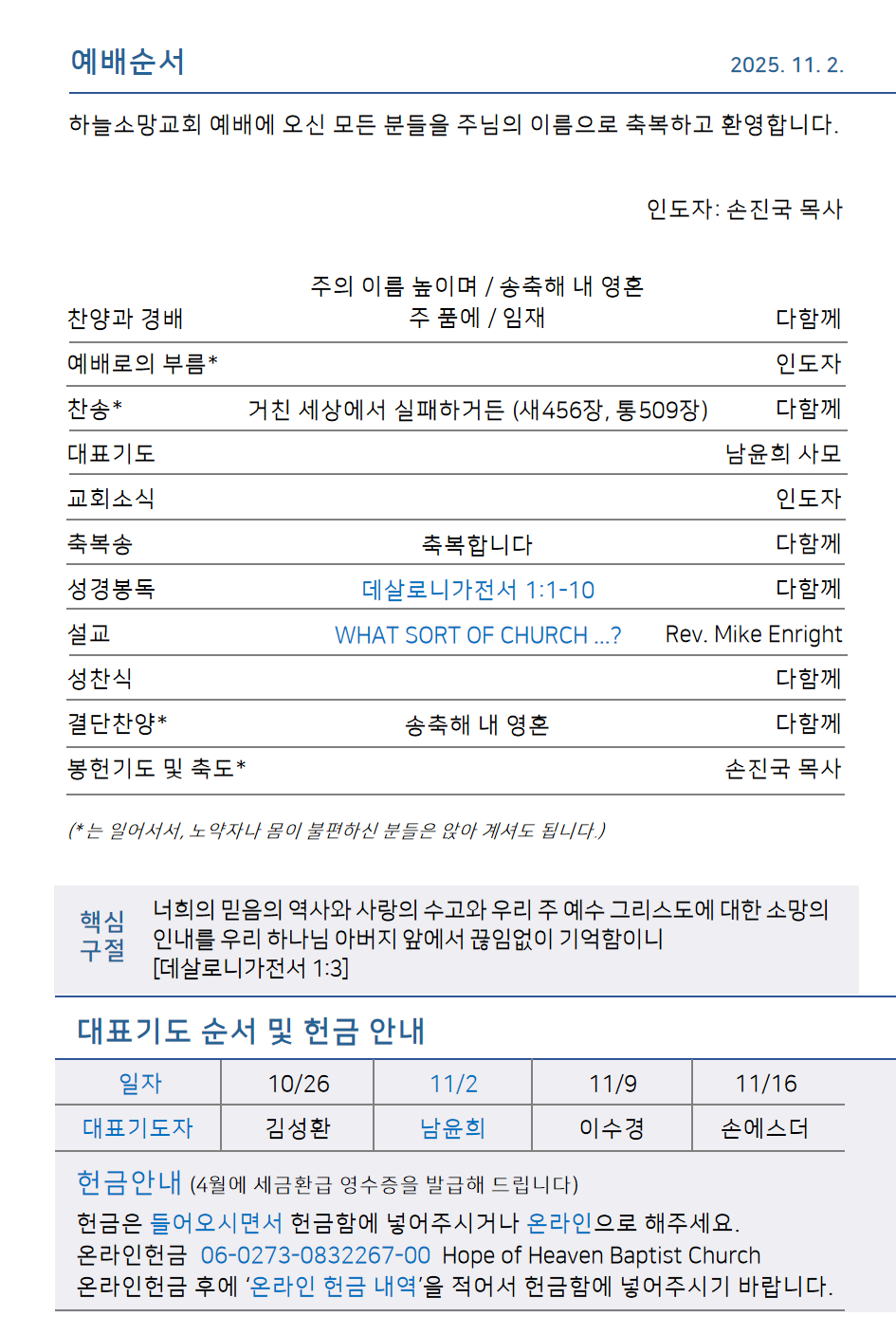 Hope of Heaven Baptist Church 하늘소망교회(담임 손진국 목사)는 뉴질랜드 오클랜드 북부 실버데일에 세워진 한인교회로 '하나님의 마음으로 사람을 살리는 교회'입니다.