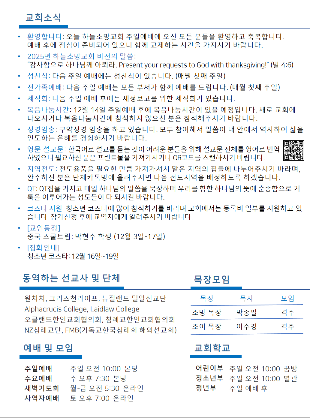Hope of Heaven Baptist Church 하늘소망교회(담임 손진국 목사)는 뉴질랜드 오클랜드 북부 실버데일에 세워진 한인교회로 '하나님의 마음으로 사람을 살리는 교회'입니다.