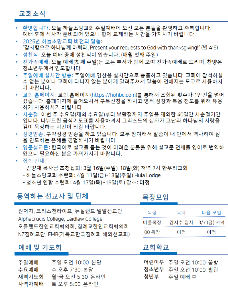 Hope of Heaven Baptist Church 하늘소망교회(담임 손진국 목사)는 뉴질랜드 오클랜드 북부 실버데일에 세워진 한인교회로 '하나님의 마음으로 사람을 살리는 교회'입니다.