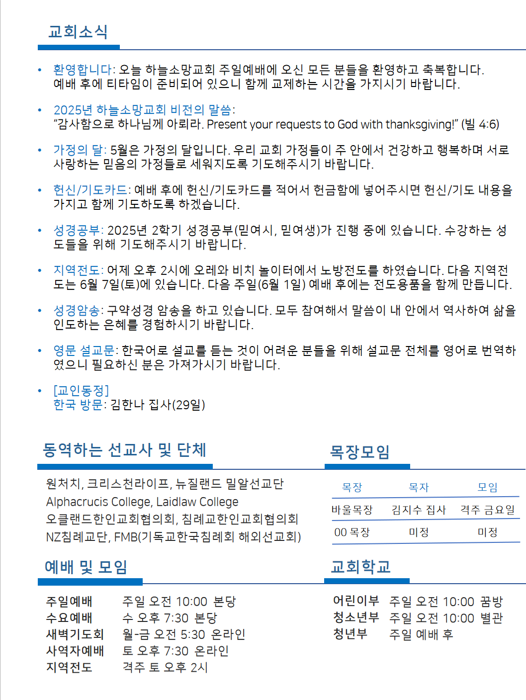 Hope of Heaven Baptist Church 하늘소망교회(담임 손진국 목사)는 뉴질랜드 오클랜드 북부 실버데일에 세워진 한인교회로 '하나님의 마음으로 사람을 살리는 교회'입니다.