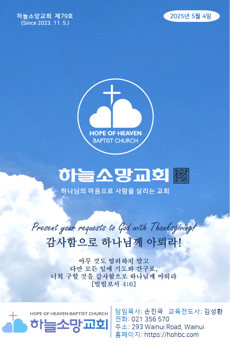 Hope of Heaven Baptist Church 하늘소망교회(담임 손진국 목사)는 뉴질랜드 오클랜드 북부 실버데일에 세워진 한인교회로 '하나님의 마음으로 사람을 살리는 교회'입니다.