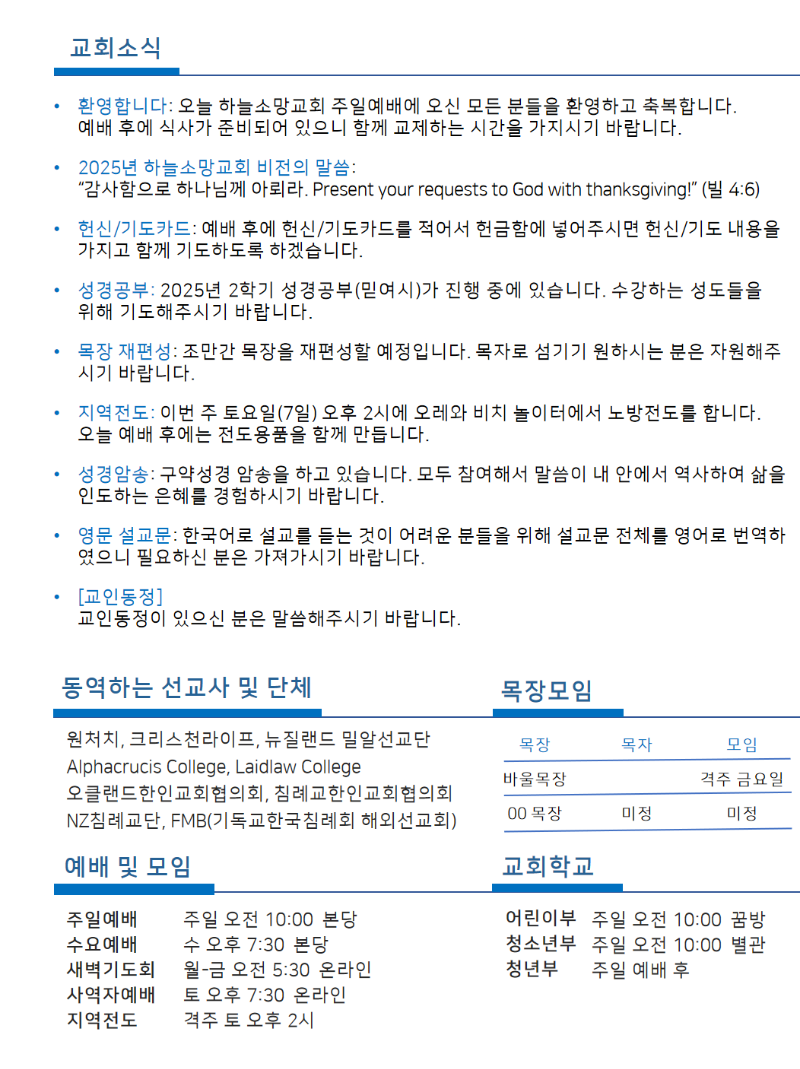 Hope of Heaven Baptist Church 하늘소망교회(담임 손진국 목사)는 뉴질랜드 오클랜드 북부 실버데일에 세워진 한인교회로 '하나님의 마음으로 사람을 살리는 교회'입니다.