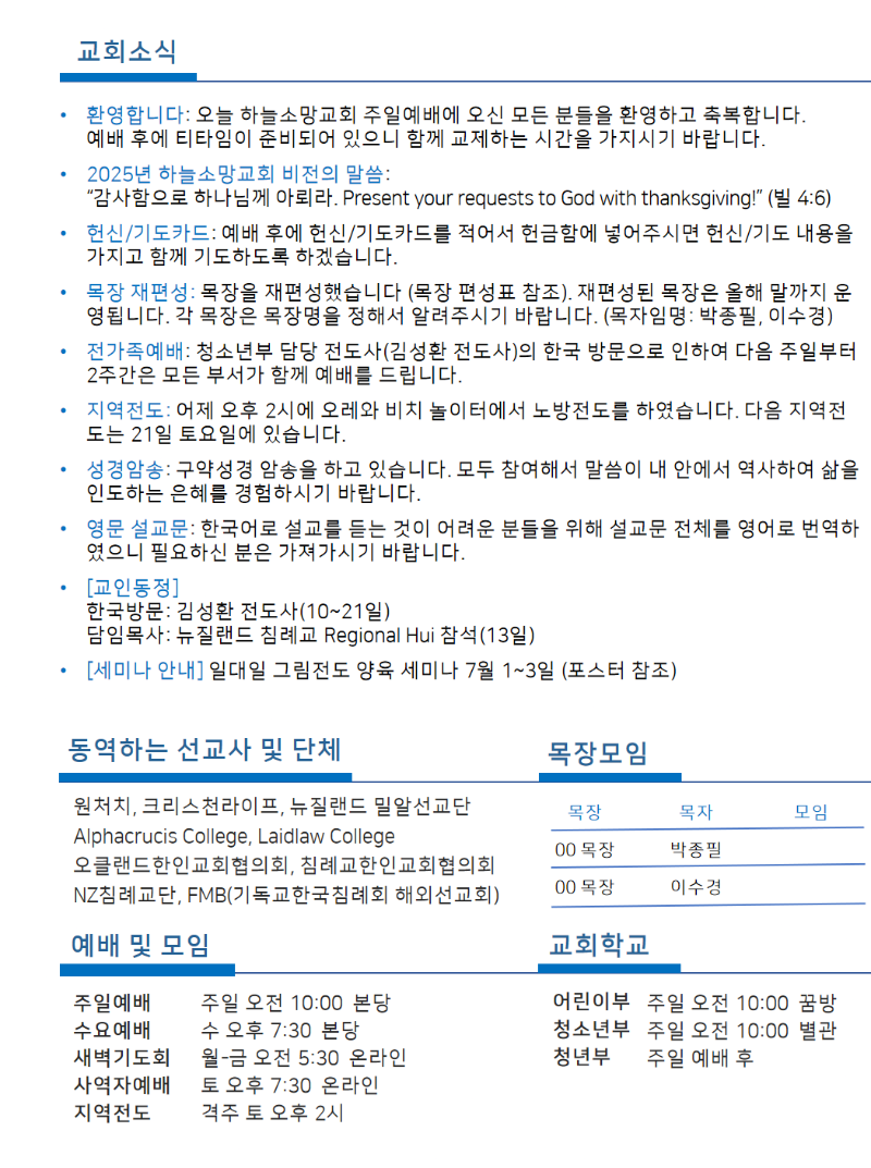 Hope of Heaven Baptist Church 하늘소망교회(담임 손진국 목사)는 뉴질랜드 오클랜드 북부 실버데일에 세워진 한인교회로 '하나님의 마음으로 사람을 살리는 교회'입니다.