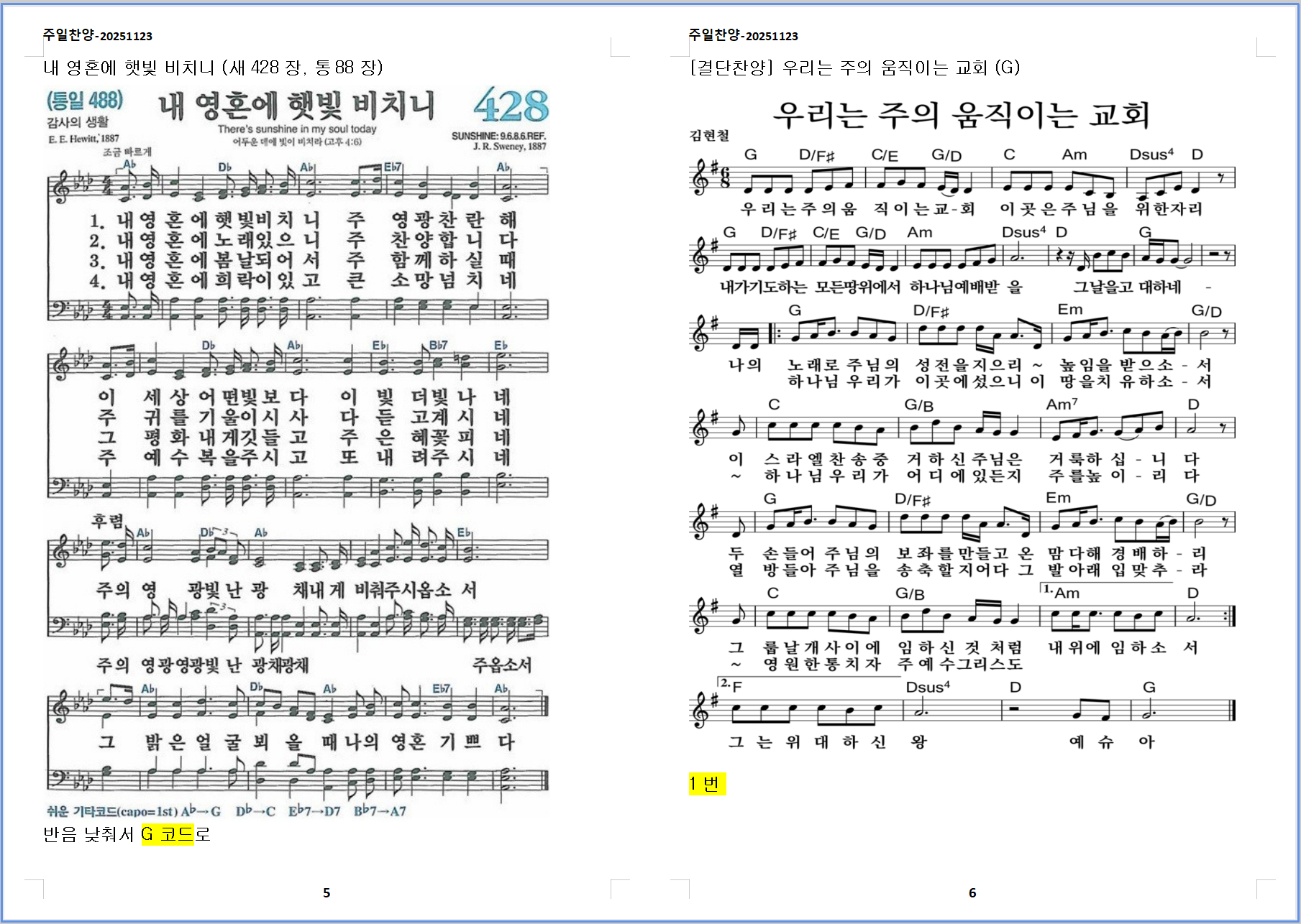 5. 찬송가 - 내 영혼에 햇빛 비치니 (새428장, 통88장)
