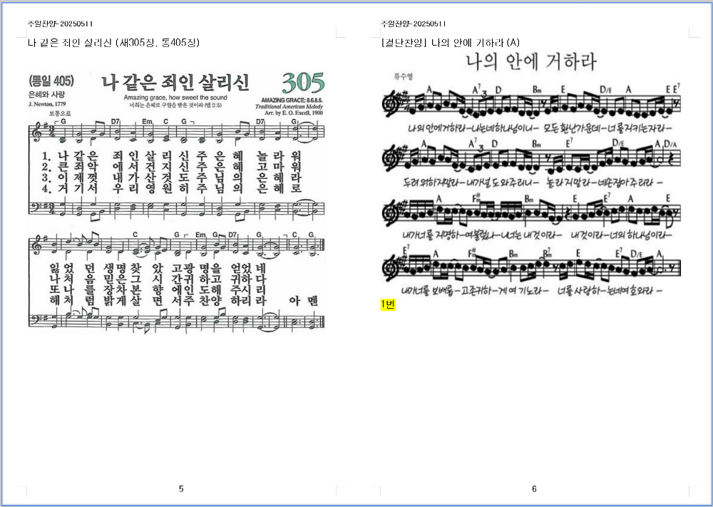 6. 찬송가 - 나 같은 죄인 살리신 (새305장, 통405장)