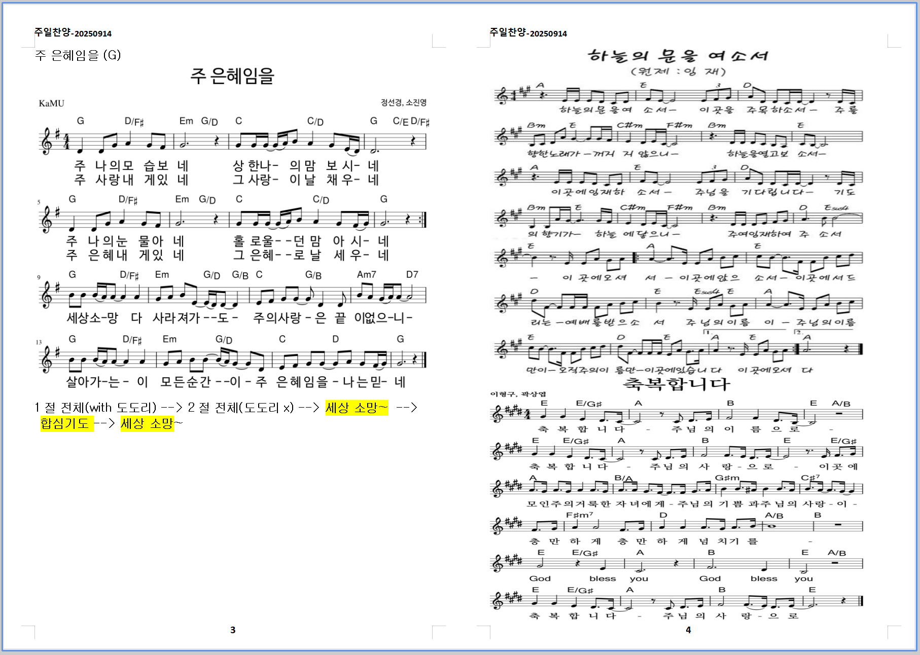 2025. 9. 14. 하늘소망교회 주일예배 찬양 콘티