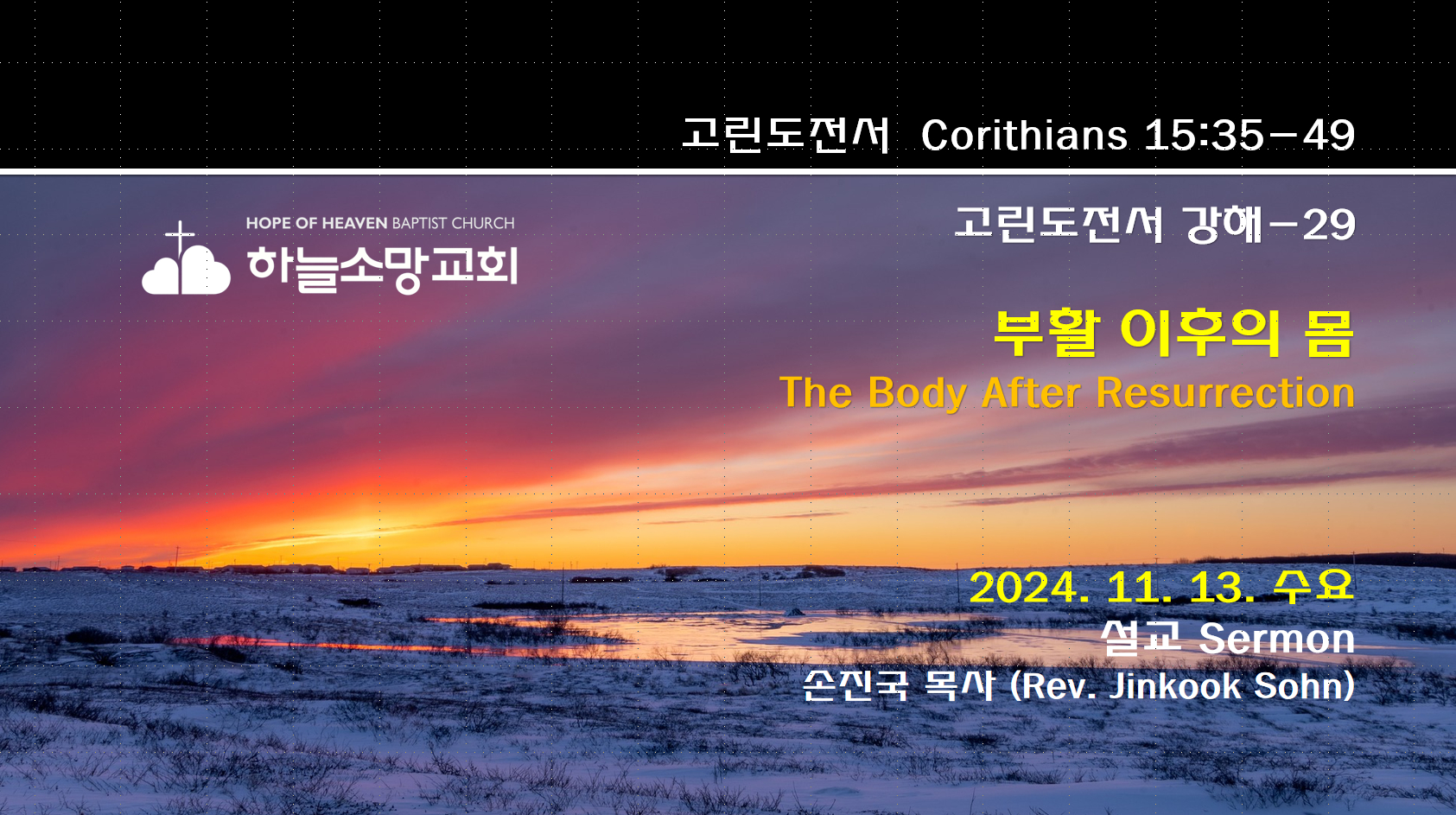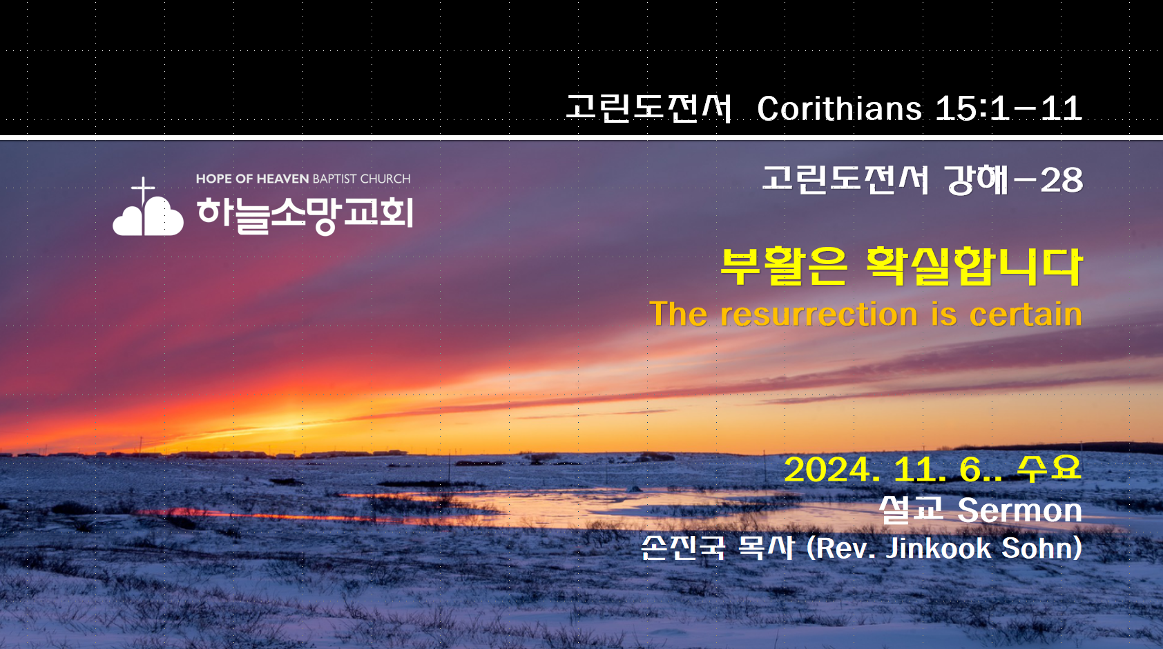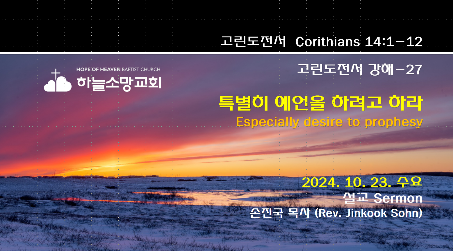 2024. 11. 27. 수요예배 고린도전서 강해-30 본문: 고린도전서 16:1-24제목: 너희 모든 일을 사랑으로 행하라설교자: 손진국 목사 [설교 mp3 파일] [고전 16:1-24]1 성도를 위하는 연보에 관하여는 내가 갈라디아 교회들에게 명한 것 같이 너희도 그렇게 하라2 매주 첫날에 너희 각 사람이 수입에 따라 모아 두어서 내가 갈 때에 연보를 하지 않게 하라3 내가 이를 때에 너희가 인정한 사람에게 편지를 주어 너희의 은혜를 예루살렘으로 가지고 가게 하리니4 만일 나도 가는 것이 합당하면 그들이 나와 함께 가리라5 내가 마게도냐를 지날 터이니 마게도냐를 지난 후에 너희에게 가서6 혹 너희와 함께 머물며 겨울을 지낼 듯도 하니 이는 너희가 나를 내가 갈 곳으로 보내어 주..