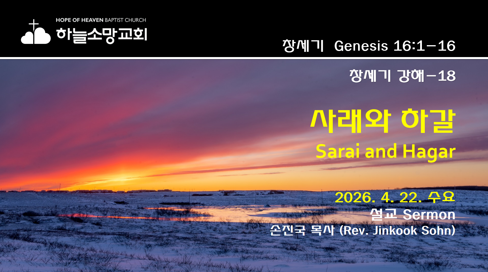 [2026. 4. 22.] (창18) 사래와 하갈 | 창세기 16:1-162026. 4. 22. 수요예배 창세기 강해-18 본문: 창세기 16:1-16제목: 사래와 하갈설교자: 손진국 목사 [설교 mp3 파일] [창 16:1-16]1 아브람의 아내 사래는 출산하지 못하였고 그에게 한 여종이 있으니 애굽 사람이요 이름은 하갈이라2 사래가 아브람에게 이르되 여호와께서 내 출산을 허락하지 아니하셨으니 원하건대 내 여종에게 들어가라 내가 혹 그로 말미암아 자녀를 얻을까 하노라 하매 아브람이 사래의 말을 들으니라3 아브람의 아내 사래가 그 여종 애굽 사람 하갈을 데려다가 그 남편 아브람에게 첩으로 준 때는 아브람이 가나안 땅에 거주한 지 십 년 후였더라4 아브람이 하갈과 동침하였더니 하갈이 임신하..