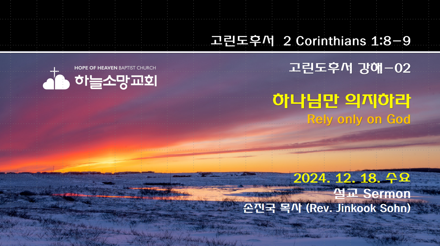 2024. 12. 18. 수요예배 고린도후서 강해-2 본문: 고린도후서 1:8-9제목: 하나님만 의지하라설교자: 손진국 목사 [설교 mp3 파일] [고후 1:8-9]8 형제들아 우리가 아시아에서 당한 환난을 너희가 모르기를 원하지 아니하노니 힘에 겹도록 심한 고난을 당하여 살 소망까지 끊어지고9 우리는 우리 자신이 사형 선고를 받은 줄 알았으니 이는 우리로 자기를 의지하지 말고 오직 죽은 자를 다시 살리시는 하나님만 의지하게 하심이라 Hope of Heaven Baptist Church 하늘소망교회(담임 손진국 목사)는 뉴질랜드 오클랜드 북부 실버데일에 세워진 한인교회로 '하나님의 마음으로 사람을 살리는 교회'입니다.