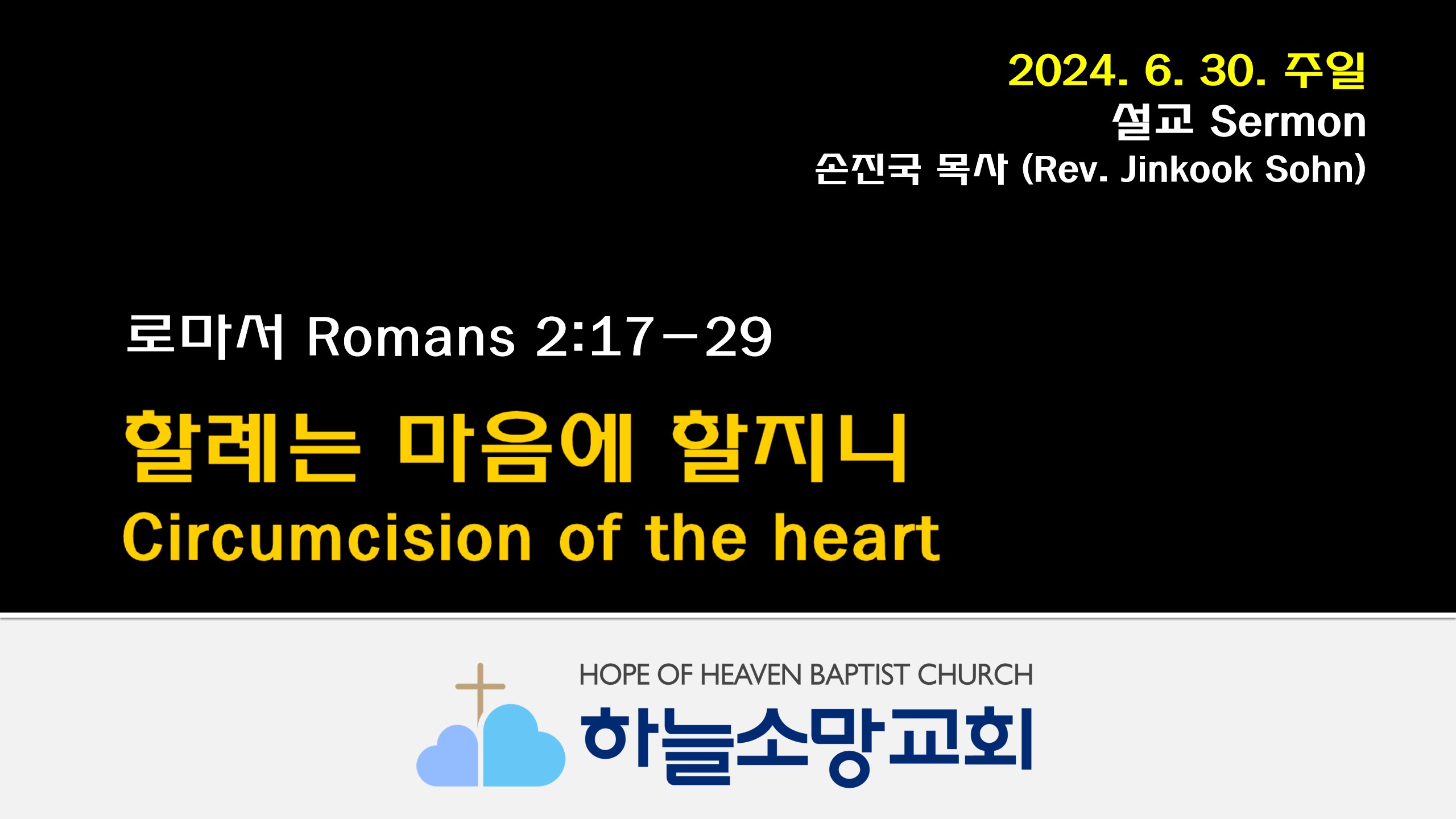 [ 2024. 6. 30.] (로마서 강해 5) 할례는 마음에 할지니 | 로마서 2:17-29 2024. 6. 30. 주일예배 설교-로마서 강해 5 본문: 로마서 2:17-29제목: 할례는 마음에 할지니설교자: 손진국 목사 [롬 2:17-29]17 유대인이라 불리는 네가 율법을 의지하며 하나님을 자랑하며18 율법의 교훈을 받아 하나님의 뜻을 알고 지극히 선한 것을 분간하며19 맹인의 길을 인도하는 자요 어둠에 있는 자의 빛이요20 율법에 있는 지식과 진리의 모본을 가진 자로서 어리석은 자의 교사요 어린 아이의 선생이라고 스스로 믿으니21 그러면 다른 사람을 가르치는 네가 네 자신은 가르치지 아니하느냐 도둑질하지 말라 선포하는 네가 도둑질하느냐22 간음하지 말라 말하는 네가 간음하느냐 우상을 가증히 여기는 네가 신전 물건을 도둑질하느냐23 율법을 자랑하는 네가 율법을 범함으.. 설교 Sermon/주일예배 Sunday 2024.06.30