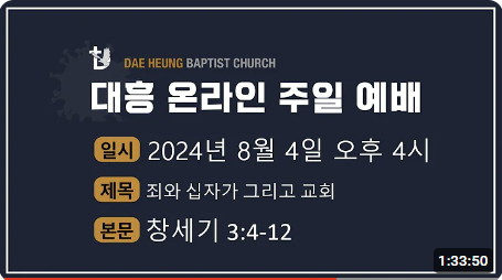 2024. 8. 4. 대흥교회 주일예배 설교본문: 창세기 3:4-12제목: 죄와 십자가 그리고 교회 (부제: 공동체로 부르신 이유)설교자: 손진국 목사 [창 3:4-12]4   뱀이 여자에게 이르되 너희가 결코 죽지 아니하리라5   너희가 그것을 먹는 날에는 너희 눈이 밝아져 하나님과 같이 되어 선악을 알 줄 하나님이 아심이니라6   여자가 그 나무를 본즉 먹음직도 하고 보암직도 하고 지혜롭게 할 만큼 탐스럽기도 한 나무인지라 여자가 그 열매를 따먹고 자기와 함께 있는 남편에게도 주매 그도 먹은지라7   이에 그들의 눈이 밝아져 자기들이 벗은 줄을 알고 무화과나무 잎을 엮어 치마로 삼았더라8   그들이 그 날 바람이 불 때 동산에 거니시는 여호와 하나님의 소리를 듣고 아담과 그의 아내가 여호와 하나님의 ..