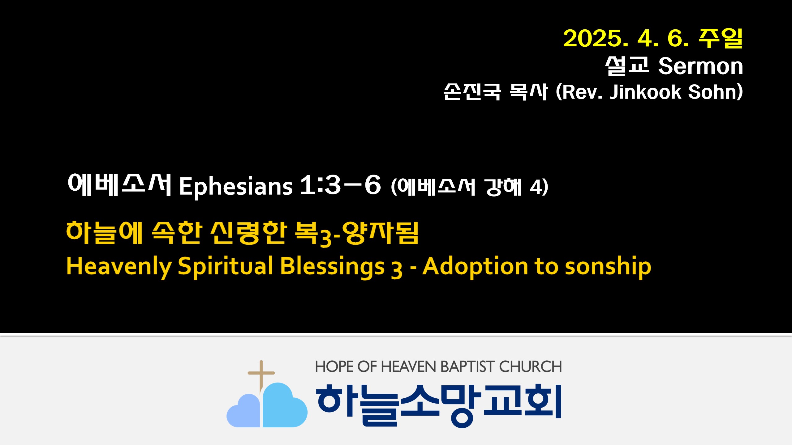 2025. 4. 6. 주일예배 설교- 에베소서 강해 4본문: 에베소 서 1:3-6제목: 하늘에 속한 신령한 복3-양자됨설교자: 손진국 목사 https://youtube.com/live/5uk6FOxzFS8 [엡 1:3-6]3 찬송하리로다 하나님 곧 우리 주 예수 그리스도의 아버지께서 그리스도 안에서 하늘에 속한 모든 신령한 복을 우리에게 주시되4 곧 창세 전에 그리스도 안에서 우리를 택하사 우리로 사랑 안에서 그 앞에 거룩하고 흠이 없게 하시려고5 그 기쁘신 뜻대로 우리를 예정하사 예수 그리스도로 말미암아 자기의 아들들이 되게 하셨으니6 이는 그가 사랑하시는 자 안에서 우리에게 거저 주시는 바 그의 은혜의 영광을 찬송하게 하려는 것이라 Hope of Heaven Baptist Church ..