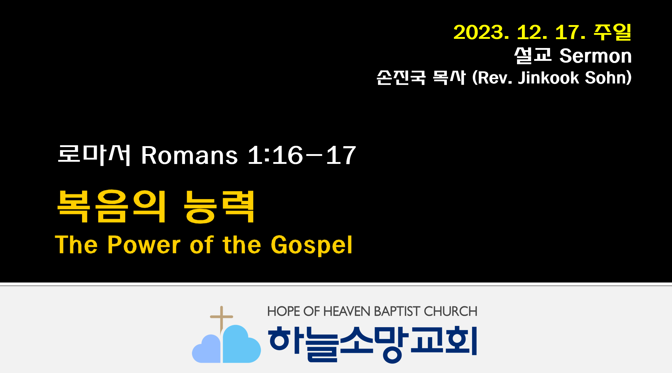 [2023. 12. 17.] 복음의 능력 | 로마서 1:16-17 2023. 12. 17. 주일예배본문: 로마서 1:16-17제목: 복음의 능력설교자: 손진국 목사 하늘소망교회(담임 손진국 목사)는 뉴질랜드 오클랜드 북부 실버데일에 세워진 한인교회로 '하나님의 마음으로 사람을 살리는 교회'입니다. 설교 Sermon/주일예배 Sunday 2024.06.07
