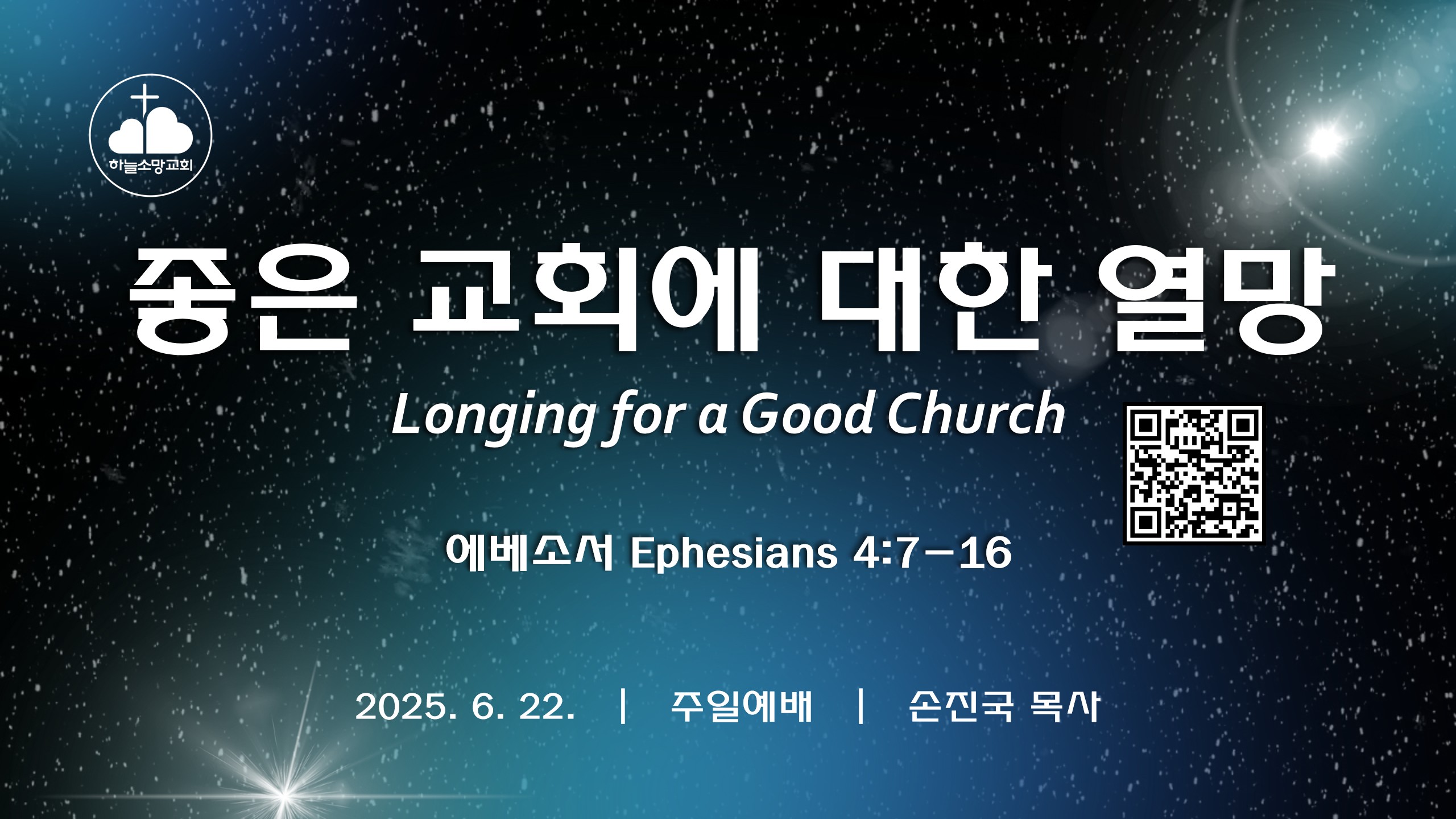 2025. 6. 22. 하늘소망교회 주일예배 동영상본문: 에베소서 4:7-16제목: 좋은 교회에 대한 열망설교자: 손진국 목사 https://youtube.com/live/olpOq1IlR70 [엡 4:7-16]7 우리 각 사람에게 그리스도의 선물의 분량대로 은혜를 주셨나니8 그러므로 이르기를 그가 위로 올라가실 때에 사로잡혔던 자들을 사로잡으시고 사람들에게 선물을 주셨다 하였도다9 올라가셨다 하였은즉 땅 아래 낮은 곳으로 내리셨던 것이 아니면 무엇이냐10 내리셨던 그가 곧 모든 하늘 위에 오르신 자니 이는 만물을 충만하게 하려 하심이라11 그가 어떤 사람은 사도로, 어떤 사람은 선지자로, 어떤 사람은 복음 전하는 자로, 어떤 사람은 목사와 교사로 삼으셨으니12 이는 성도를 온전하게..