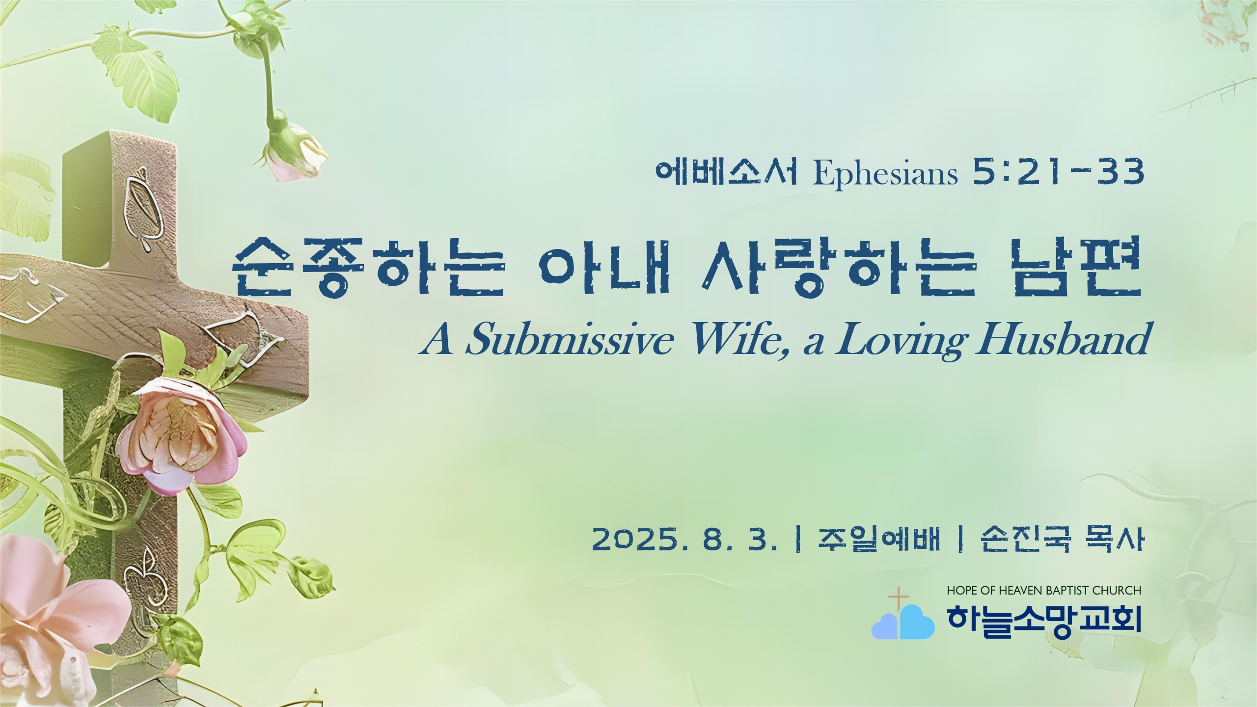 [ 2025. 8. 3.] (에베소서 강해 19) 순종하는 아내 사랑하는 남편 | 에베소서 5:21-33 https://youtu.be/a4ZC1uYf6PM 2025. 8. 3. 주일예배 설교- 에베소서 강해 19본문: 에베소서 5:21-33 제목: 순종하는 아내 사랑하는 남편 설교자: 손진국 목사 [엡 5:21-33]21 그리스도를 경외함으로 피차 복종하라22 아내들이여 자기 남편에게 복종하기를 주께 하듯 하라23 이는 남편이 아내의 머리 됨이 그리스도께서 교회의 머리 됨과 같음이니 그가 바로 몸의 구주시니라24 그러므로 교회가 그리스도에게 하듯 아내들도 범사에 자기 남편에게 복종할지니라25 남편들아 아내 사랑하기를 그리스도께서 교회를 사랑하시고 그 교회를 위하여 자신을 주심 같이..