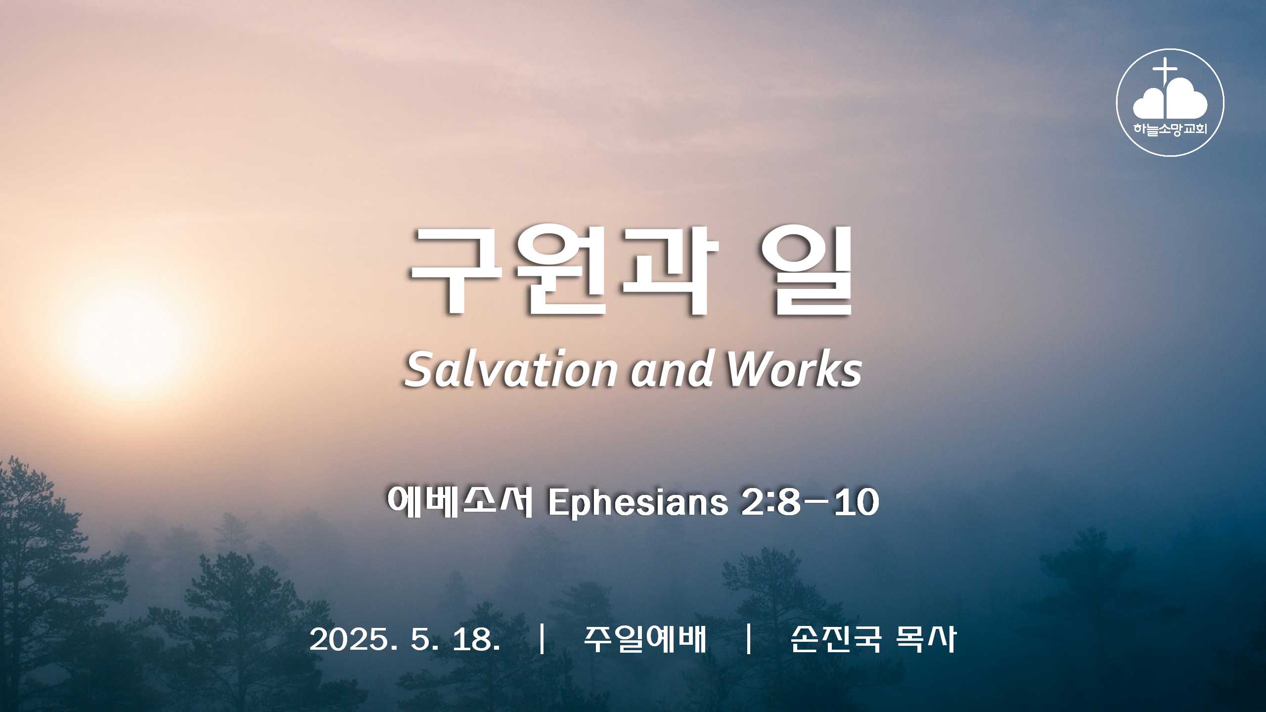 [ 2025. 5. 18.] (에베소서 강해 9) 구원과 일 | 에베소서 2:8-10 https://youtu.be/gEgDIsNI1Bk 2025. 4. 1. 주일예배 설교- 에베소서 강해 9 본문: 에베소 서 2:8-10제목: 구원과 일설교자: 손진국 목사 [엡 2:8-10]8 너희는 그 은혜에 의하여 믿음으로 말미암아 구원을 받았으니 이것은 너희에게서 난 것이 아니요 하나님의 선물이라9 행위에서 난 것이 아니니 이는 누구든지 자랑하지 못하게 함이라10 우리는 그가 만드신 바라 그리스도 예수 안에서 선한 일을 위하여 지으심을 받은 자니 이 일은 하나님이 전에 예비하사 우리로 그 가운데서 행하게 하려 하심이니라 Hope of Heaven Baptist Church 하늘소망교회(담임 손진국 목사..