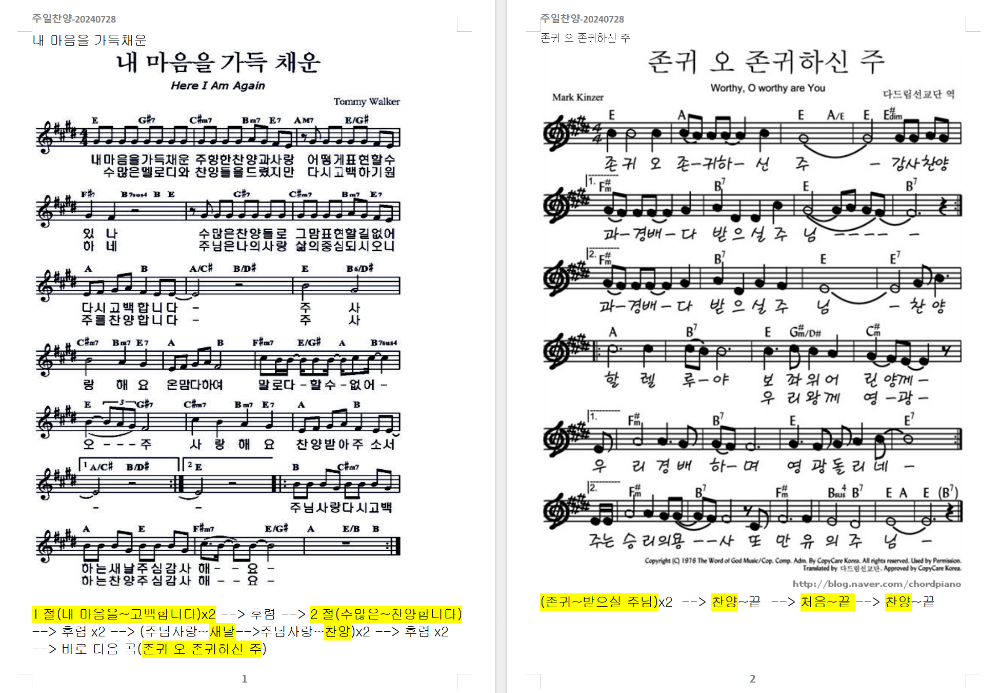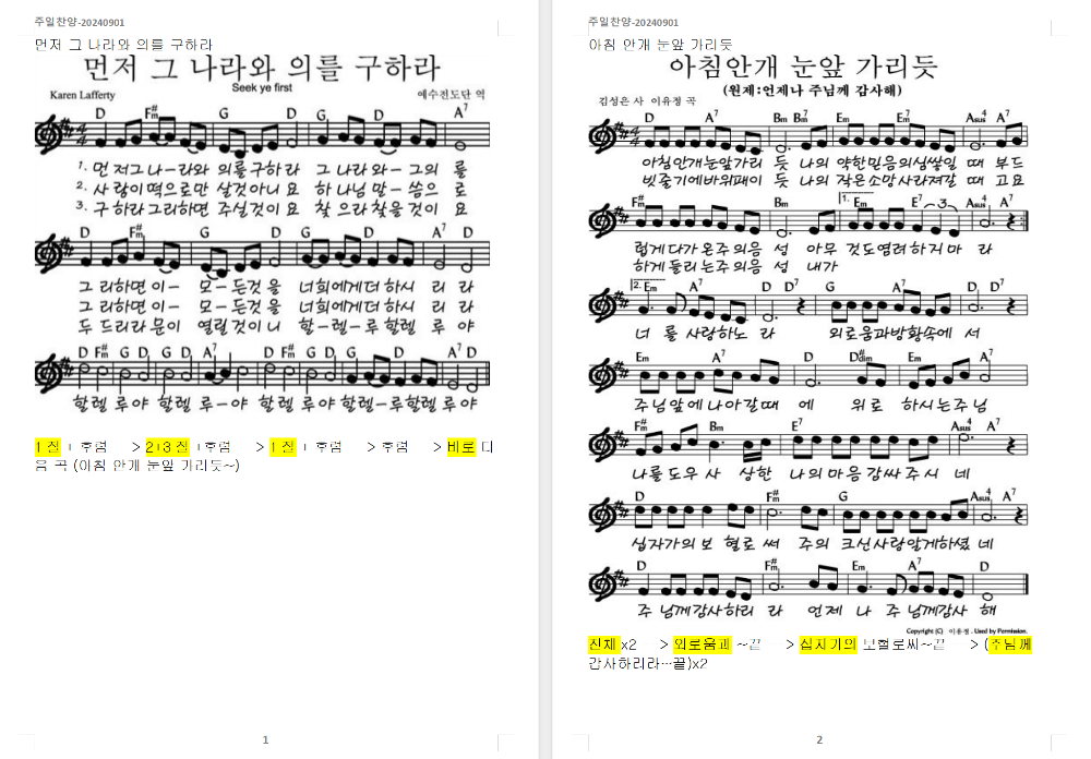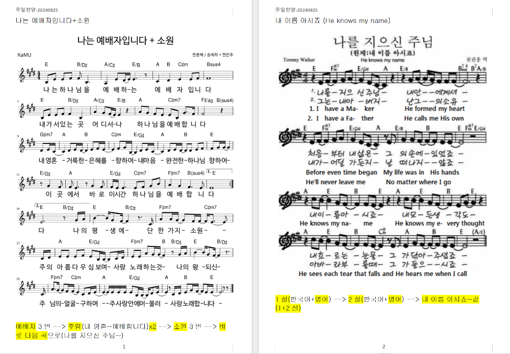 2024. 9. 8. 하늘소망교회 주일찬양 콘티1. 꽃들도 (G코드)2. 내 눈 주의 영광을 보네 (G코드)3. 주가 일하시네 (A코드)4. 예수 우리 왕이여 (A 코드)5. 찬송가 - 저 장미꽃 위에 이슬 (새442장, 통499장)6. [축복송] 축복합니다 (E코드)6. [결단찬양] 주가 일하시네 (A코드) [찬양 스캔-1000] Hope of Heaven Baptist Church 하늘소망교회(담임 손진국 목사)는 뉴질랜드 오클랜드 북부 실버데일에 세워진 한인교회로 '하나님의 마음으로 사람을 살리는 교회'입니다.