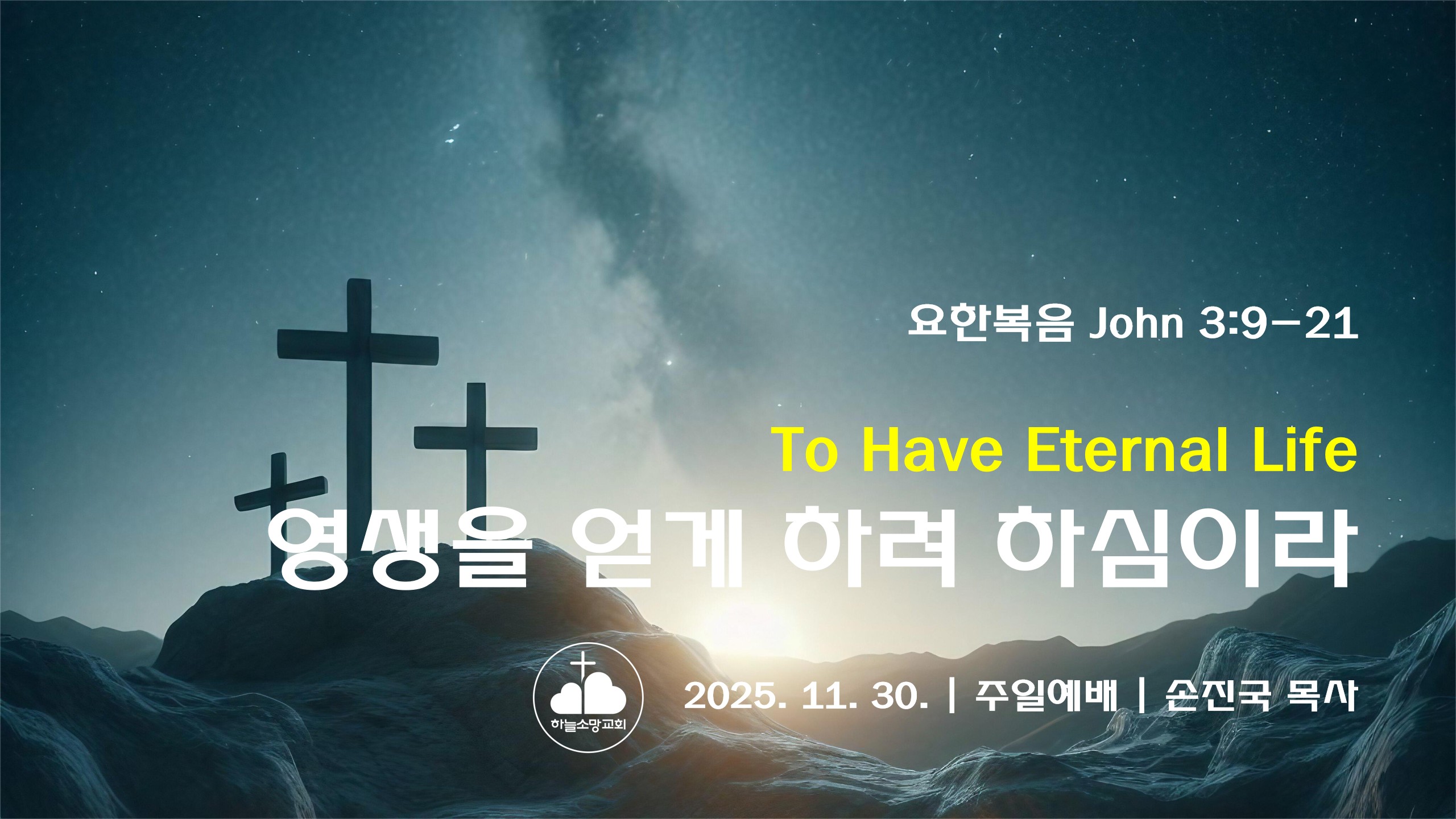 2025. 11. 30. 하늘소망교회 주일예배 동영상본문: 요한복음 3:9-21제목: 영생을 얻게 하려 하심이라설교자: 손진국 목사 https://youtu.be/xTvBGlwmQo8 [요 3:9-21]9 니고데모가 대답하여 이르되 어찌 그러한 일이 있을 수 있나이까10 예수께서 그에게 대답하여 이르시되 너는 이스라엘의 선생으로서 이러한 것들을 알지 못하느냐11 진실로 진실로 네게 이르노니 우리는 아는 것을 말하고 본 것을 증언하노라 그러나 너희가 우리의 증언을 받지 아니하는도다12 내가 땅의 일을 말하여도 너희가 믿지 아니하거든 하물며 하늘의 일을 말하면 어떻게 믿겠느냐13 하늘에서 내려온 자 곧 인자 외에는 하늘에 올라간 자가 없느니라14 모세가 광야에서 뱀을 든 것 같이 인자..