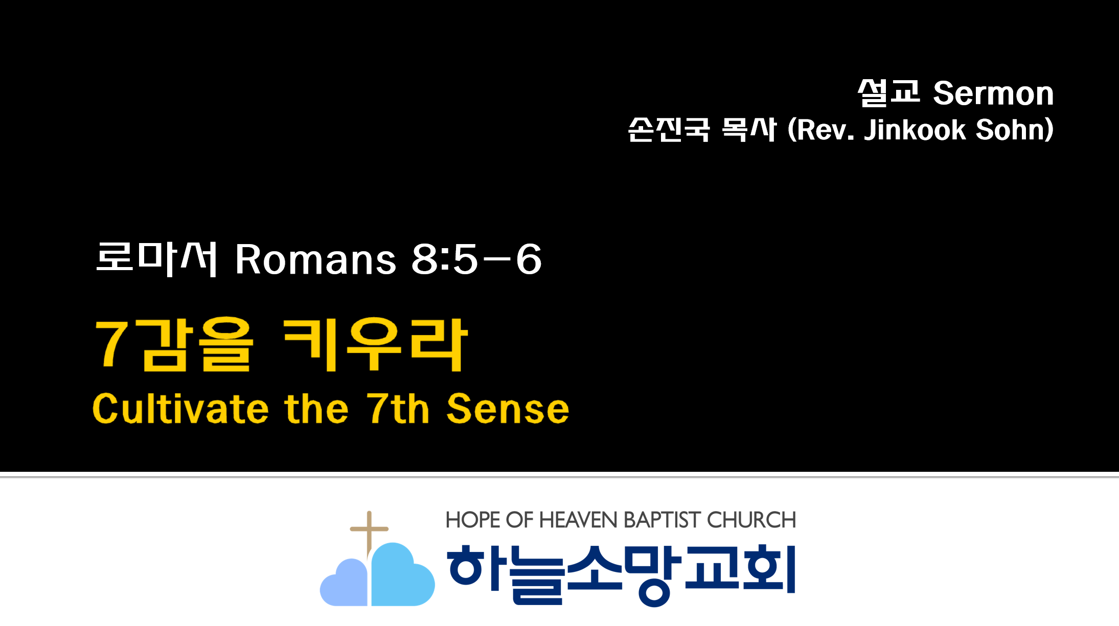 하늘소망교회(담임 손진국 목사)는 뉴질랜드 오클랜드 북부 실버데일에 세워진 한인교회로 '하나님의 마음으로 사람을 살리는 교회'입니다. 2023. 11. 19. 주일예배본문: 로마서 8:5-6제목: 7감을 키우라설교자: 손진국 목사